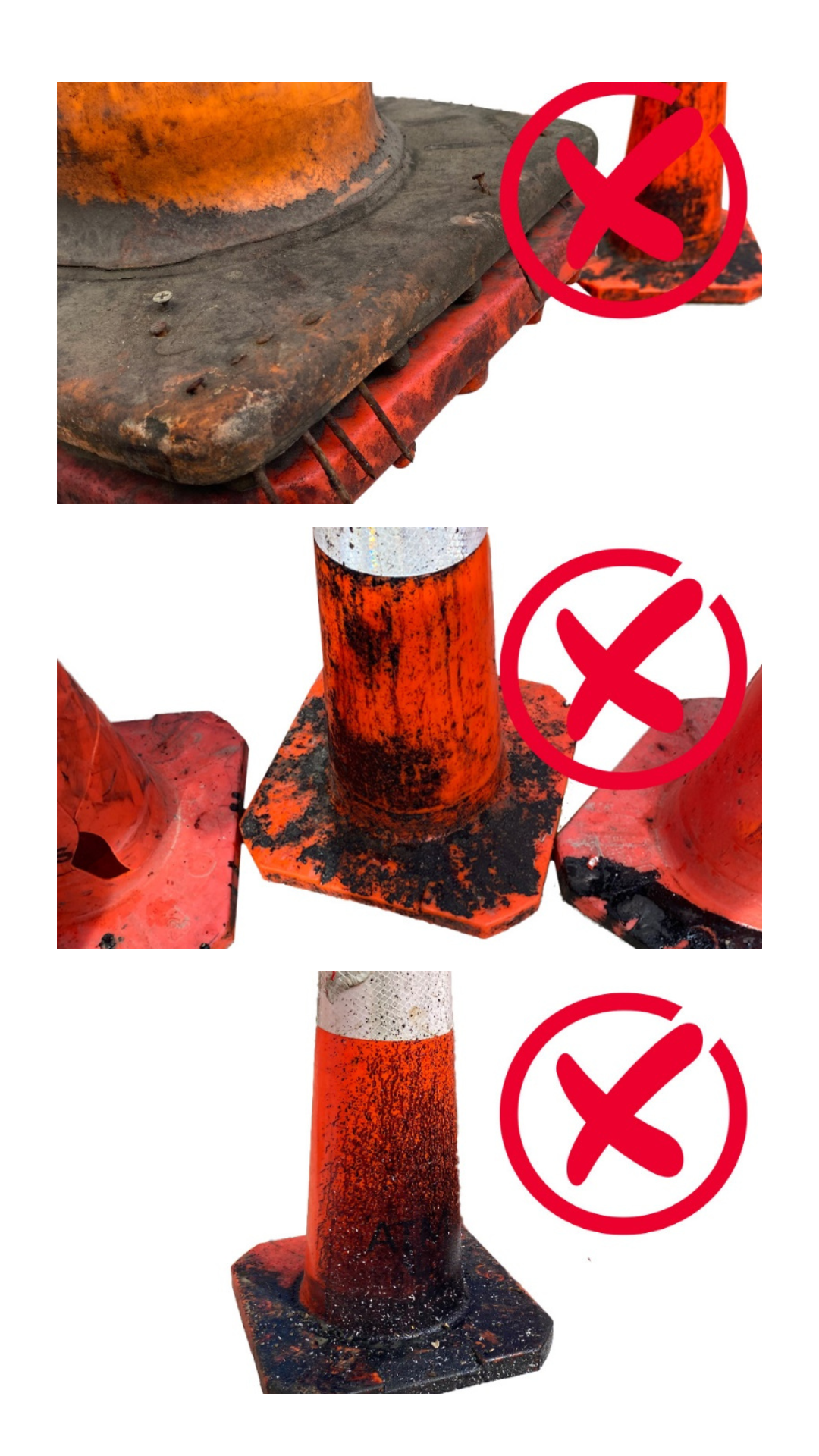 If the cone has a large amounts of bitumen (tar) and or gravel covering them, then they cannot be recycled as they cannot go through the shredder and be reused. Broken bases or small broken parts of a cone by themselves are not acceptable. If these are returned, then the customer will be charged for the disposal of these as they cannot be recycled. If there is any doubt about the ability to return the cones for recycling, then please contact Proline Plastics for clarification.
